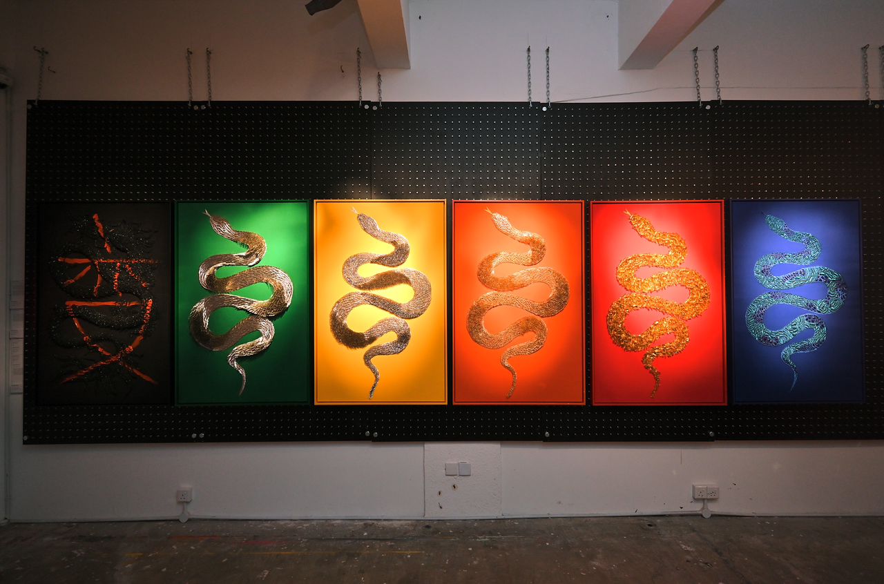 Fue en este punto de transición — entre 龙 (jerga) y cambiar (Bian) — que la dirección del trabajo se hizo más clara. El simbolismo de la Serpiente proporcionó un marco concreto para esta siguiente fase de exploración. Bernard creó inmediatamente la primera colección de la exposición, “MITOS de Aura”, que comprende cuatro obras en distintos colores, cada una de las cuales representa una forma de transformación: Renovación, Espiritualidad, Iluminación y Pasión. Este cuerpo de trabajo inaugural inició el viaje de un año después de su retiro de Vipassana y se extendió a lo largo del ciclo completo del año de la Serpiente. “MITOS de Aura” comenzó el año como la cabeza metafórica de la serpiente.