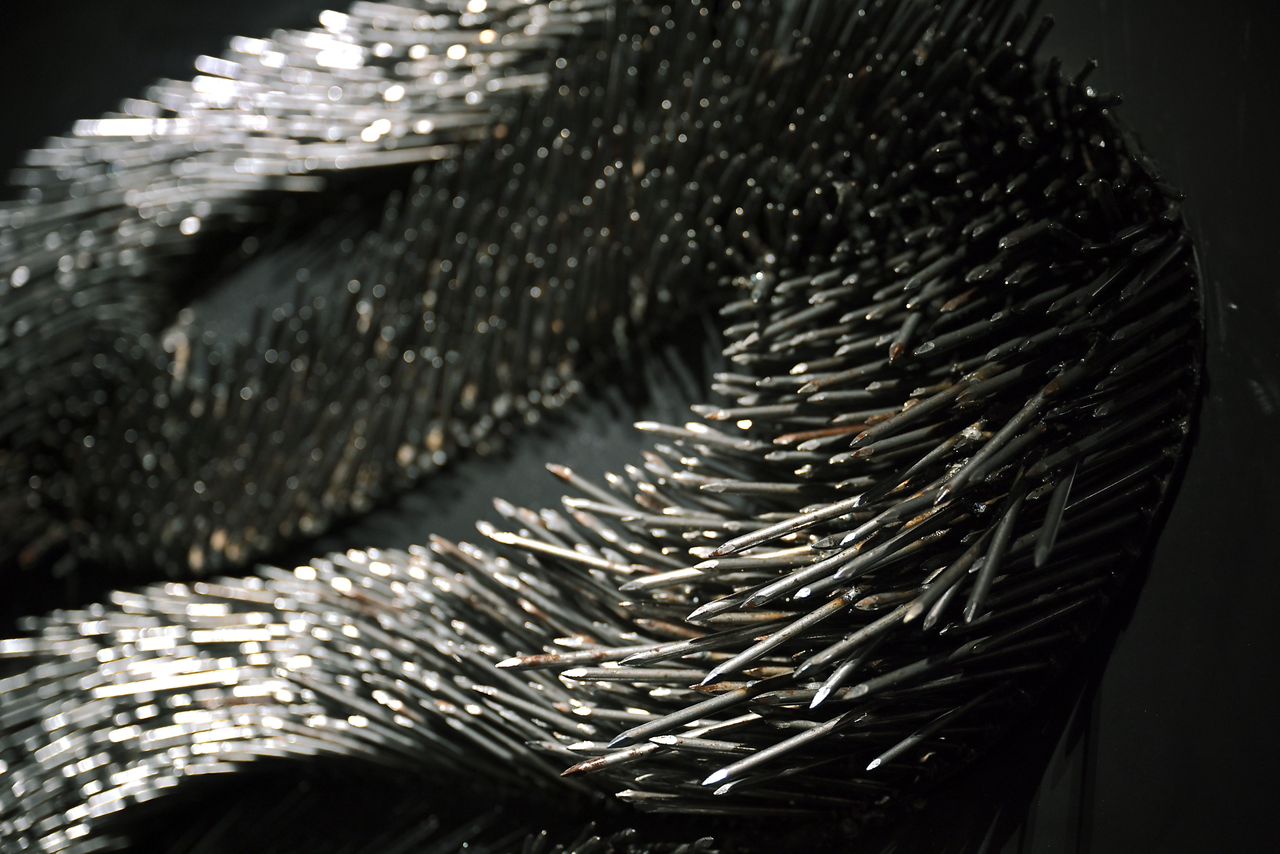 En tus lienzos yuxtapones materiales de origen precioso, como piedras turquesas, con elementos muy crudos como clavos de acero. ¿Podrías darnos más detalles sobre esta combinación poco convencional de materiales?