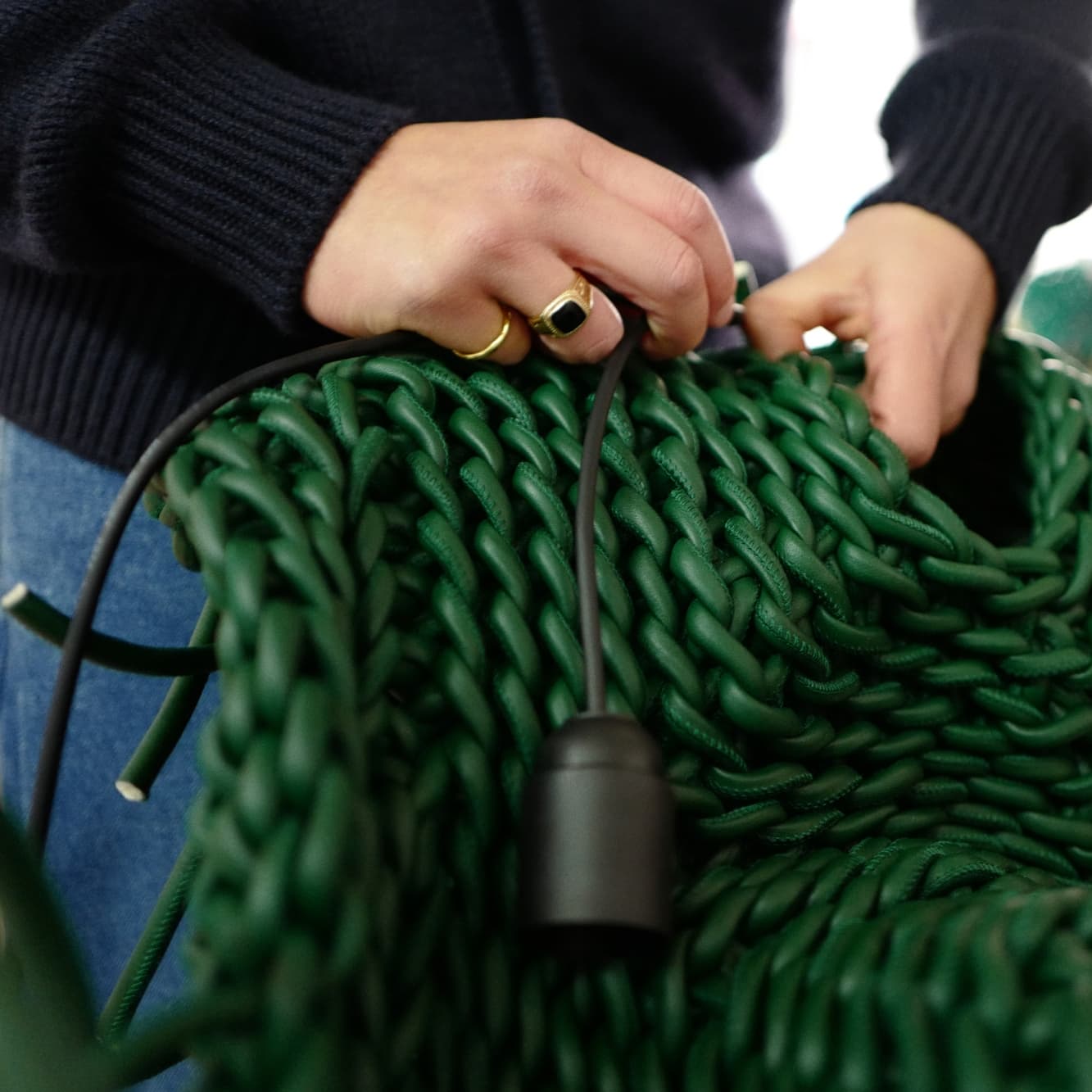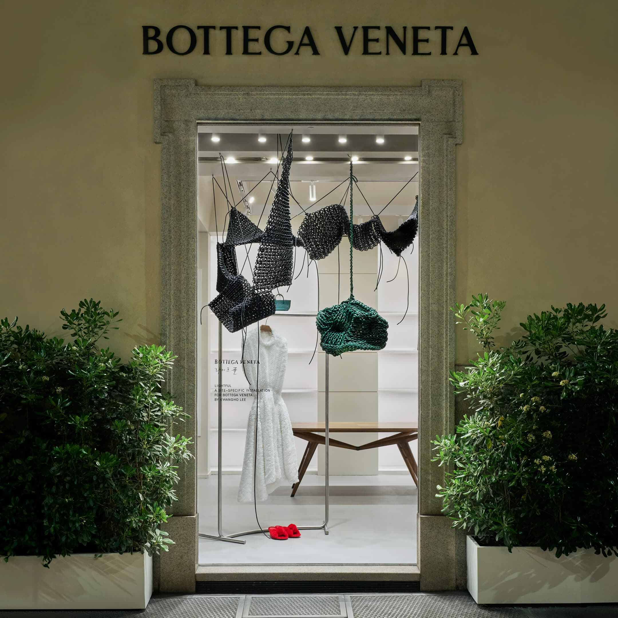 Para la Semana del Diseño de Milán 2026, Bottega Veneta colaboró con el artista coreano Kwangho Lee en una instalación específica titulada «Lightful», presentada en la tienda de la casa en Via Sant’Andrea, junto con una serie de activaciones en todo Milán. La instalación combinó una estructura tejida suspendida característica de la práctica de Lee con nuevas esculturas de luz tejidas con fettucce de cuero de Bottega Veneta. Desarrolladas en tonos negros y verdes seleccionados por la directora creativa Louise Trotter, las formas escultóricas adoptaron formas orgánicas variadas, moldeadas a través del enfoque de Lee basado en materiales y la interacción entre tejido, estructura e iluminación. Luces y sombras jugaron a lo largo de las obras, ampliando su exploración continua de cómo se comportan los materiales cuando se combinan con nuevos elementos.