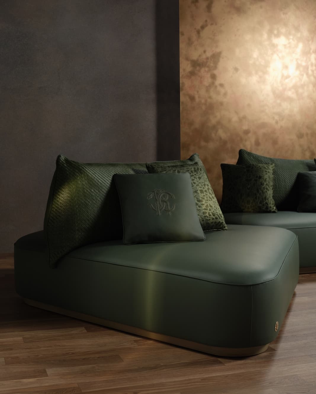 Roberto Cavalli Home presentó “Mediterranean Heritage”, una colección inmersiva que reinterpretó las raíces mediterráneas de la marca a través de un enfoque contemporáneo de la vida. La zona de estar se definió por el sistema Eivissa, con estructuras de madera de formas orgánicas con volúmenes tapizados y respaldos tubulares acabados con un tejido geométrico de cuero, junto con la librería Mitjana y el mueble bar Galdana en metal y vidrio, diseñados para reflejar la luz y evocar la superficie del mar. En el comedor, se reintrodujo la línea Boswellia con mesas esculturales en mármol Rain Forest Green y detalles metálicos integrados, incluido el monograma «Serpiente», mientras que la línea Martinica combinaba madera de haya, cuero tejido y metal envejecido en piezas de bar y salón.