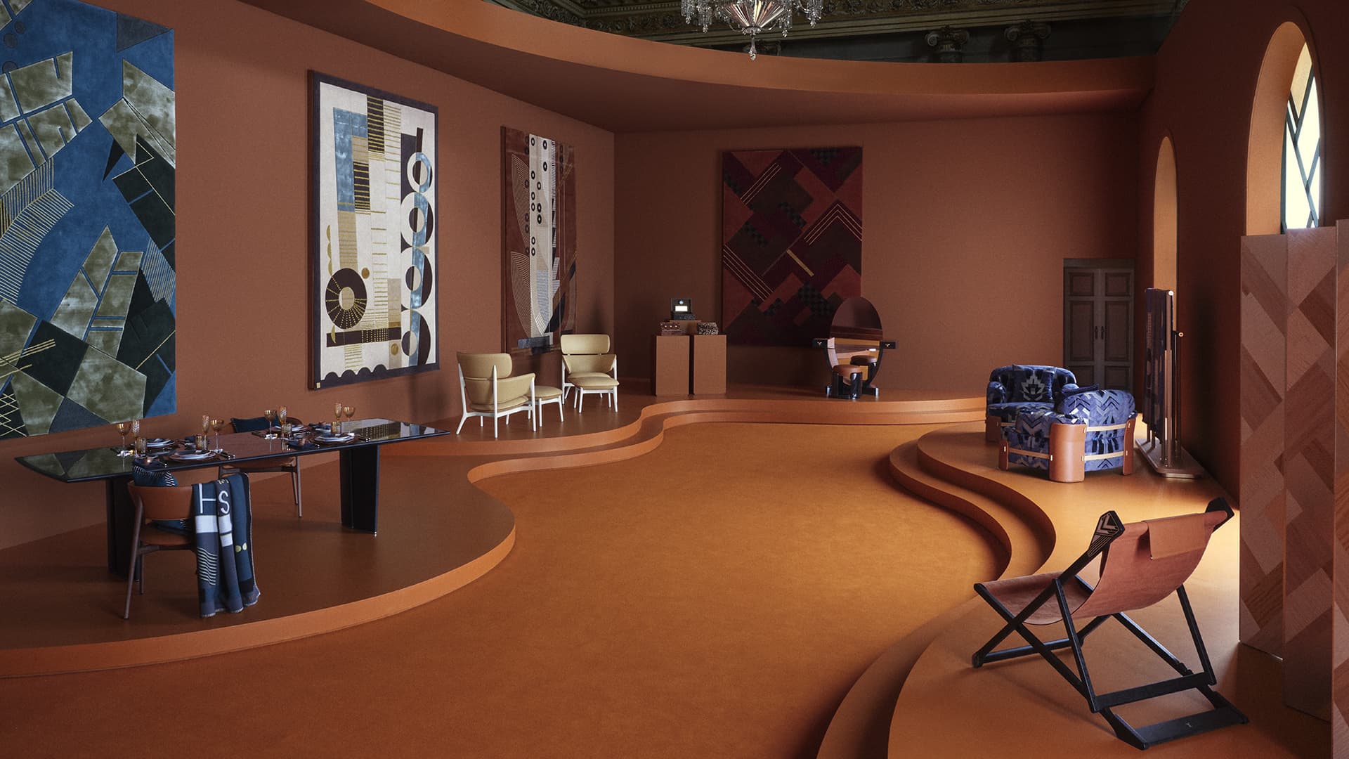 A partir de ahí, la colección Objets Nomades se presenta en entornos cada vez más inmersivos. Muebles, textiles y objetos están dispuestos en espacios concebidos como sala de estar, comedor y biblioteca, donde combinaciones de colores atrevidos y motivos gráficos crean un lenguaje visual cohesivo. Las piezas de colecciones recientes se combinan con diseños anteriores, destacando la evolución del programa y al mismo tiempo manteniendo un énfasis constante en la innovación de materiales y la colaboración con diseñadores internacionales.