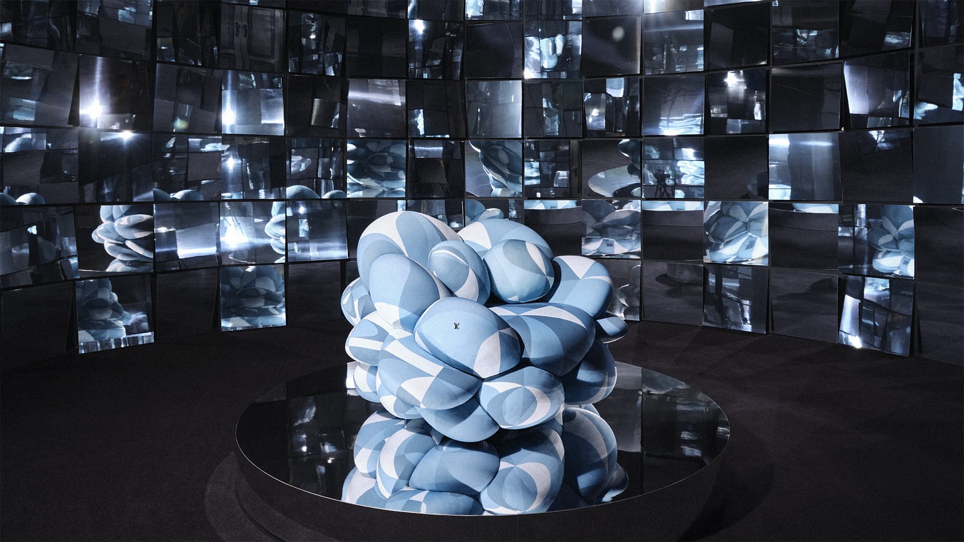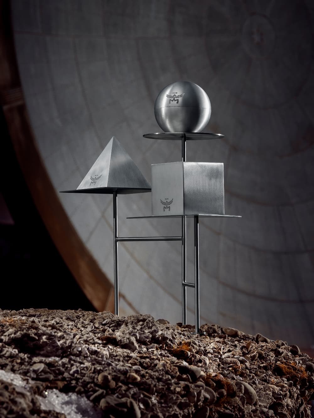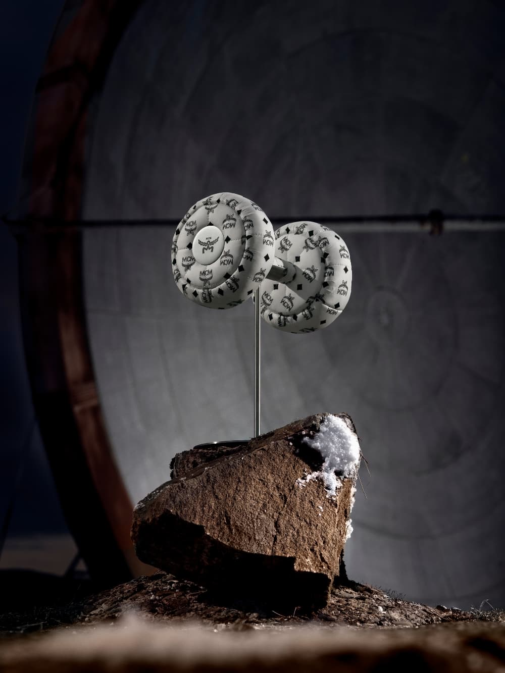 Un elemento central de la exposición fueron las piezas diseñadas por Atelier Biagetti y recicladas utilizando el monograma Visetos de MCM, incluido “Orbit”, un puf inspirado en un robot; “Gravity”: una pesa de mano diseñada para evocar la ingravidez; “Mach-1”: un casco de inspiración espacial; y “Alphabet”, una serie de velas esculturales. Juntos, estos objetos ampliaron la narrativa de la instalación en piezas de diseño funcionales que hacían eco de sus temas interplanetarios.