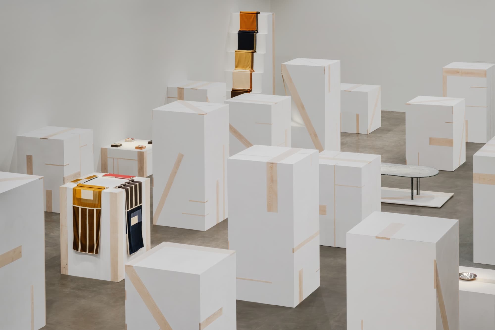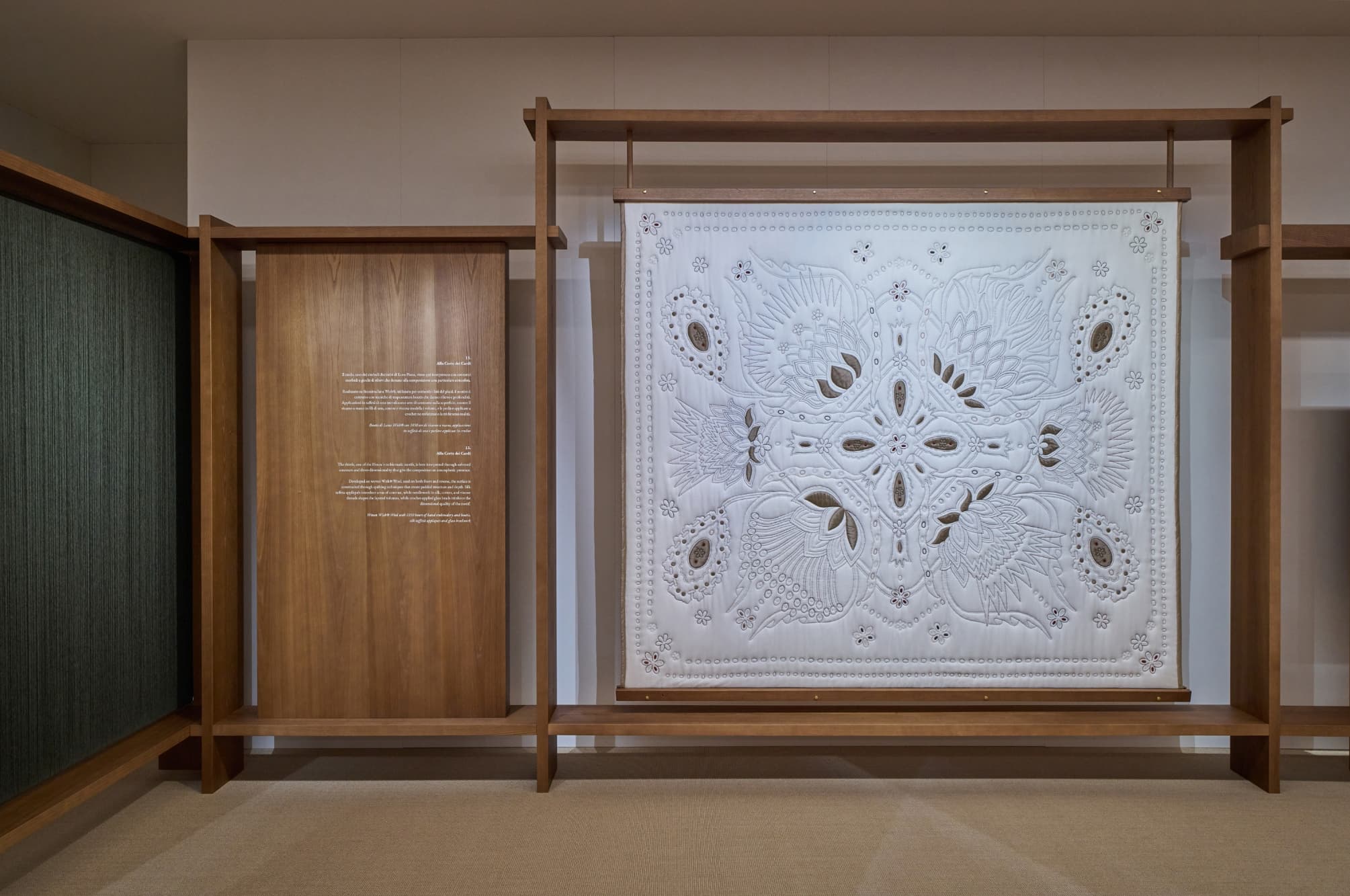 “Botanic Repertoire” exploró la flor del cardo, presente en el escudo de armas de la Casa desde 1951 e históricamente utilizada para cultivar las fibras de lana y cachemira, junto con referencias al lino vinculadas a la producción de lino. “Cardo Paisley” revisó los motivos paisley de los archivos, introducidos en las colecciones de telas de Loro Piana a finales de la década de 1960, mientras que “Textured Abstractions” giró hacia composiciones no figurativas definidas por la superficie, la densidad y la estructura de las fibras en lugar del motivo. A lo largo de la exposición, cada cuadros se construyó utilizando técnicas que incluyen tejido en telar manual, tejido jacquard, punzonado, apliques, bordado a mano y serigrafía. Los materiales incluyeron Vicuña, Baby Cashmere, Cashmere, The Gift of Kings®, Loro Piana Royal Lightness®, lino, lana Wish® y lana Pecora Nera®, con motivos de archivo reelaborados en nuevas composiciones textiles.
