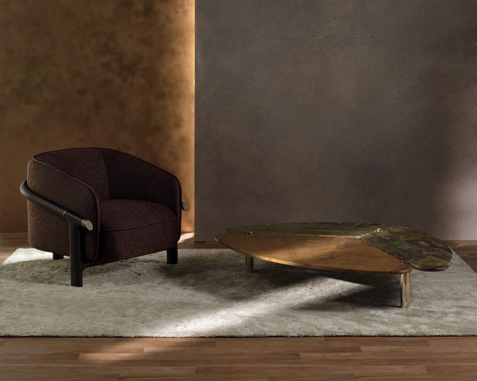 Varias salas se centran más directamente en reinterpretaciones de referencias históricas. Los textiles y los muebles se basan en las composiciones geométricas de Legrain, mientras que otros hacen referencia al trabajo de Charlotte Perriand a través de patrones y formas actualizados adaptados a los interiores contemporáneos. Entre las obras más escultóricas, la presentación incluye piezas destacadas como el Cabinet Kaléidoscope y una mesa Baby-foot reinventada de Estudio Campana, junto con Cocoon Dichroic, desarrollado con Géraldine González, que explora superficies iridiscentes y construcciones en capas. En el vestíbulo central, el sillón Stella de Raw Edges introduce una dimensión más experimental, utilizando efectos textiles y ópticos para remodelar la percepción de volumen y comodidad.