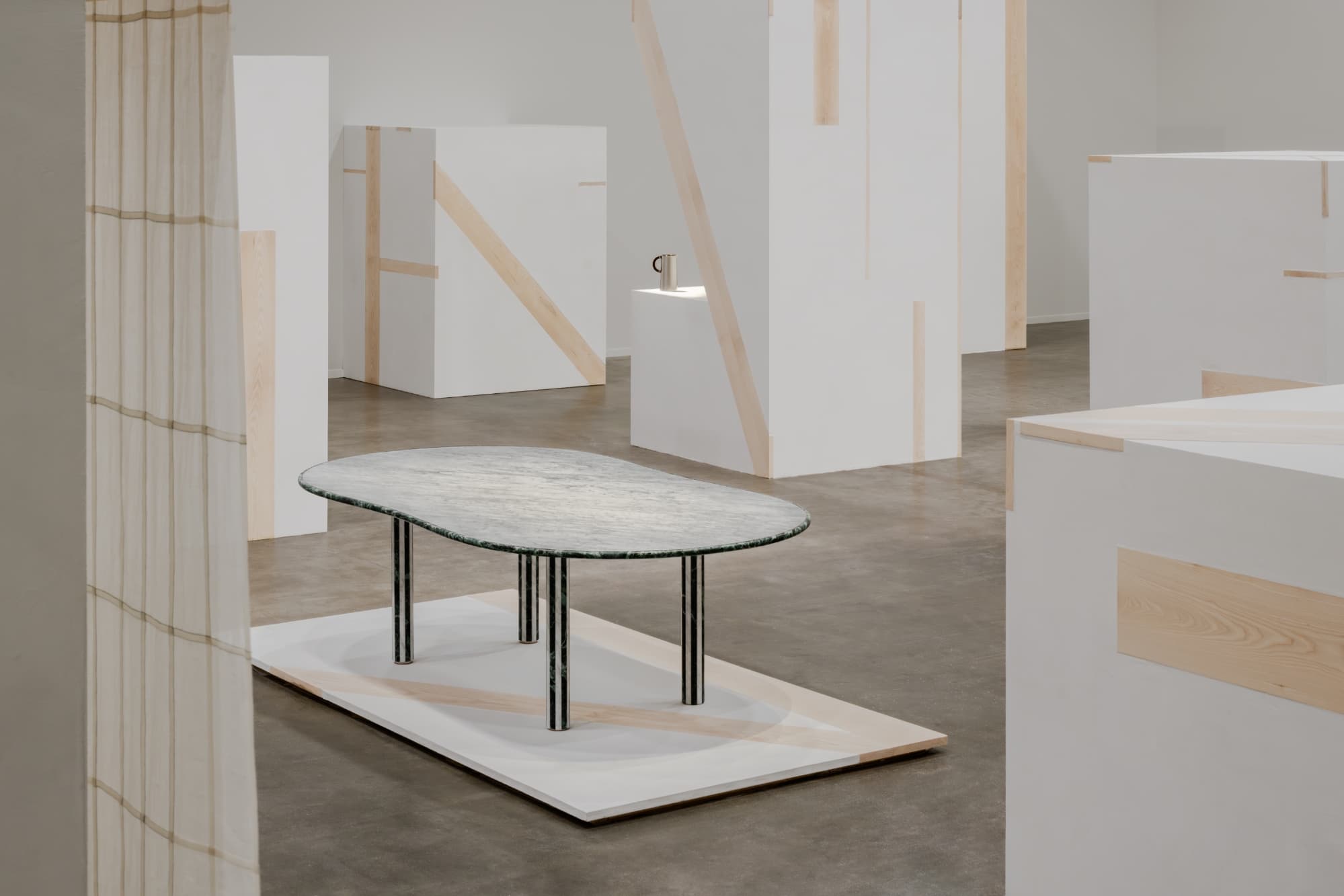 Entre los aspectos más destacados se encuentra la mesa Stadium d’Hermès de Edward Barber y Jay Osgerby, cuya forma alargada y curva recuerda tanto una pista de carreras como la línea del lomo de un caballo, una sutil referencia a los orígenes ecuestres de la Casa. Realizado en marquetería de mármol, combina la piedra de Carrara con el verde intenso Verde Alpi, compensado por patas gráficas, casi arquitectónicas, que introducen una sensación de ligereza a pesar del peso del material.