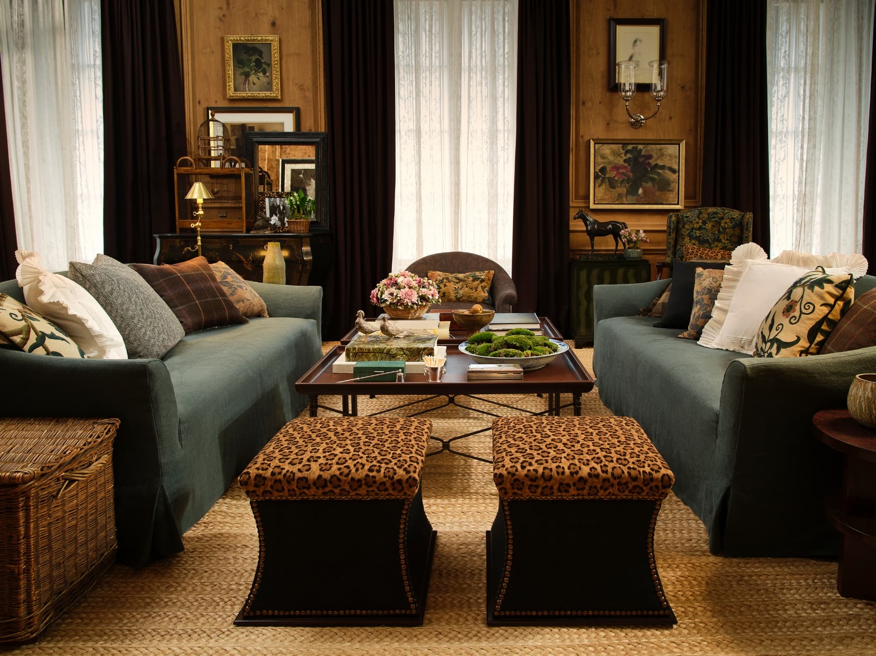 La presentación comenzó con “Saddlebrook”, un ambiente de inspiración campestre definido por interiores con paneles de roble cubiertos con terciopelos de leopardo y azul profundo, motivos florales de jacquard de color ámbar y tapices en tonos berenjena. El espacio presentaba muebles como el mueble bar Beacon en roble con influencias brutalistas y Art Déco, la mesa de comedor Parlour en caoba blanqueada con referencias Biedermeier y la mesa de cóctel Marquise que combina bronce fundido y cuero labrado. Tapicería y textiles con capas de cuadros de lana, rayas y tapices florales, junto con piezas exclusivas como el sofá curvo Lloyd en verde pizarra y la cama con dosel Saddlebrook en caoba blanqueada con una cabecera de crin negra tejida con técnicas del siglo XIX. Los objetos de iluminación y decoración incluyeron la lámpara de mesa Halpern pintada a mano con motivos de flores silvestres, la lámpara Whitlock inspirada en formas de rododendro, la vajilla floral Isabella y marcos y cajas lacados en verde esmeralda.