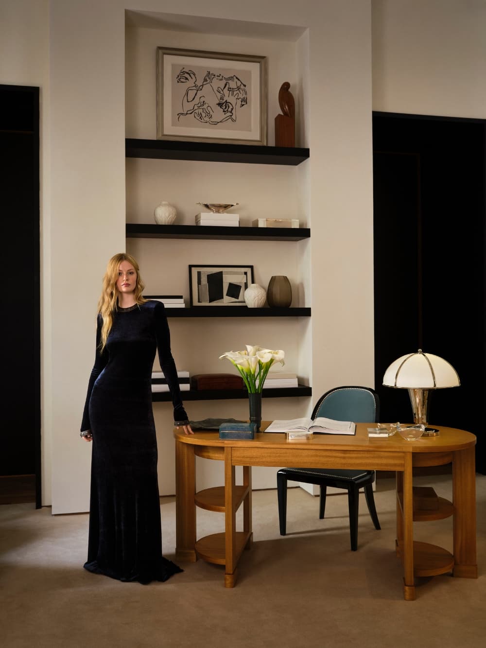 El viaje continuó hacia “Sterling Square”, un ático urbano definido por grandes columnas, interiores drapeados y una paleta de crema, camel y celadón. Aquí, el Art Déco influye en muebles moldeados como la cama Cote d’Azur en terciopelo camel, la cómoda Duke en laca negra y la mesa de cóctel Bristol con detalles en plata patinada, junto con el escritorio Hammond en caoba blanqueada. Las piezas de iluminación incluyeron la lámpara de mesa Bexley inspirada en jarrones franceses de la década de 1930 y el aplique Belmore con detalles de alabastro y acanalados, mientras que los accesorios y textiles incluyeron cajas de marquetería de paja, marcos de carey lacados y mantas de cachemira producidas en colaboración con fábricas históricas, incluidas Johnstons of Elgin y la English Pewter Company.