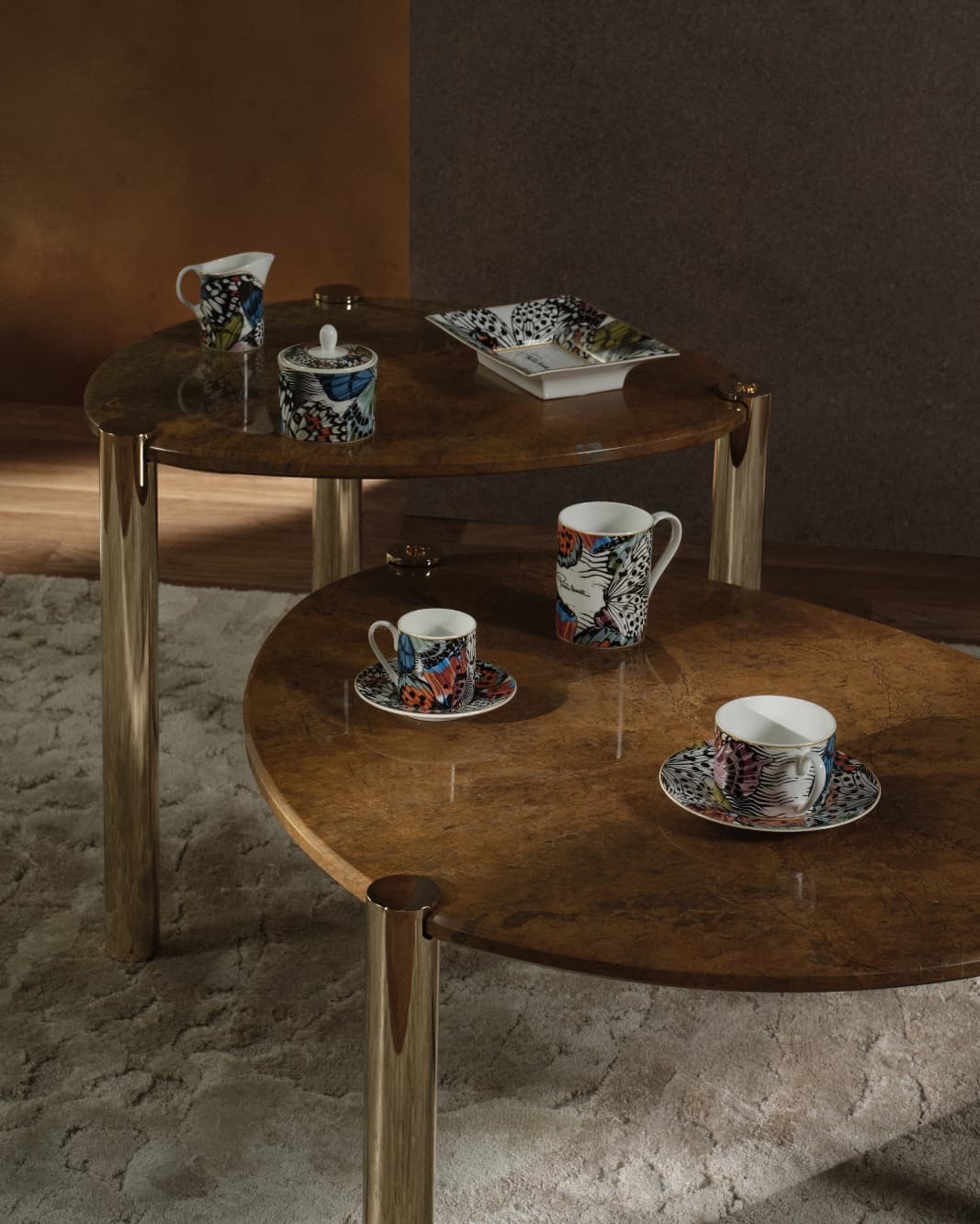 La oferta textil amplió la narrativa a través de dos colecciones contrastantes: “Winter Forest”, con densos motivos florales y detalles de pájaros representados en tonos profundos y pictóricos, y “Moonlight”, que introdujo tonos más fríos y tenues diseñados para evocar una atmósfera nocturna mediterránea a través de ropa de cama liviana de doble cara. La presentación se completó con la colección de vajillas Mariposa, definida por incrustaciones de alas de mariposa y sutiles acentos animales aplicados en café, té y piezas para servir.