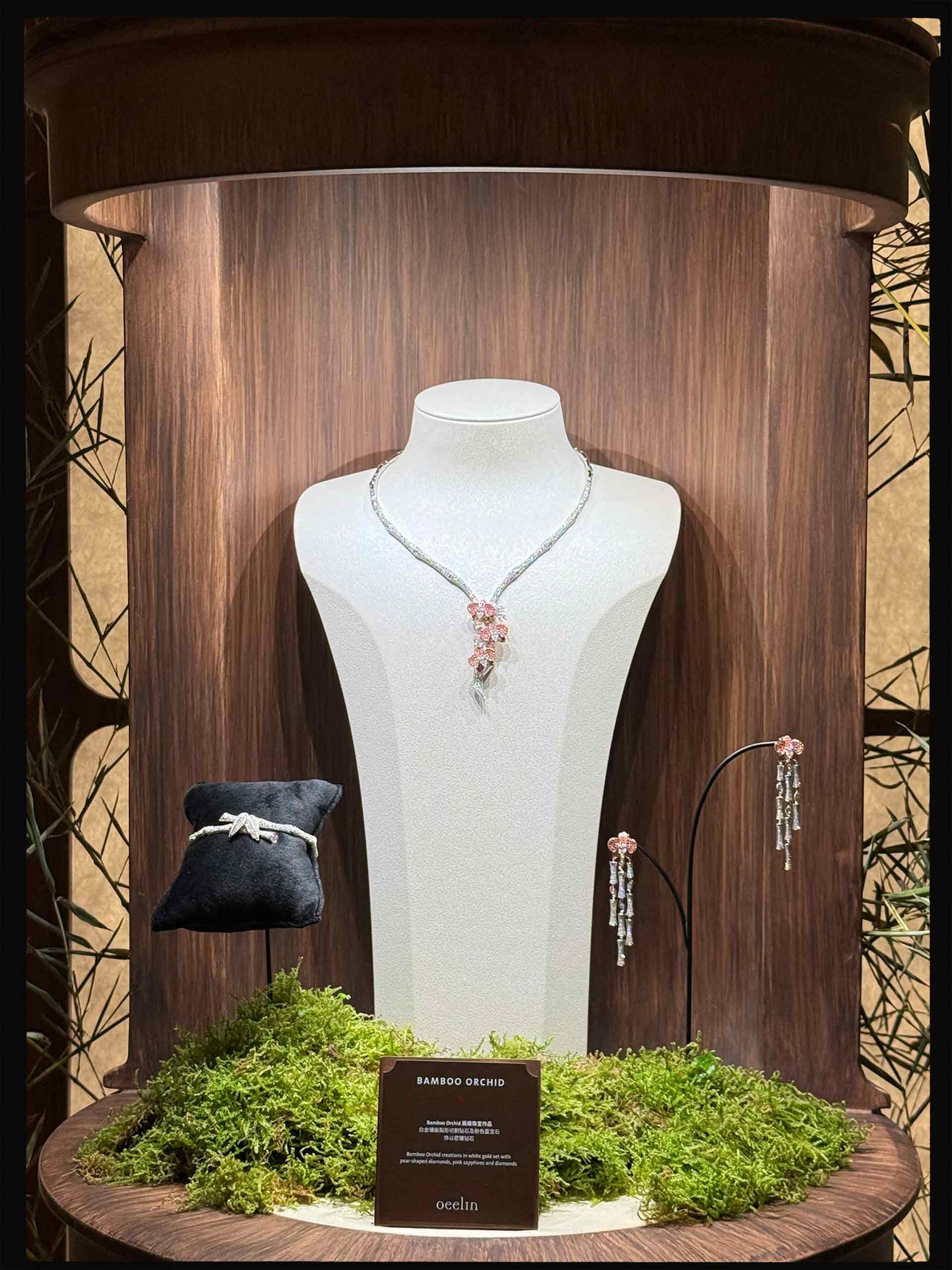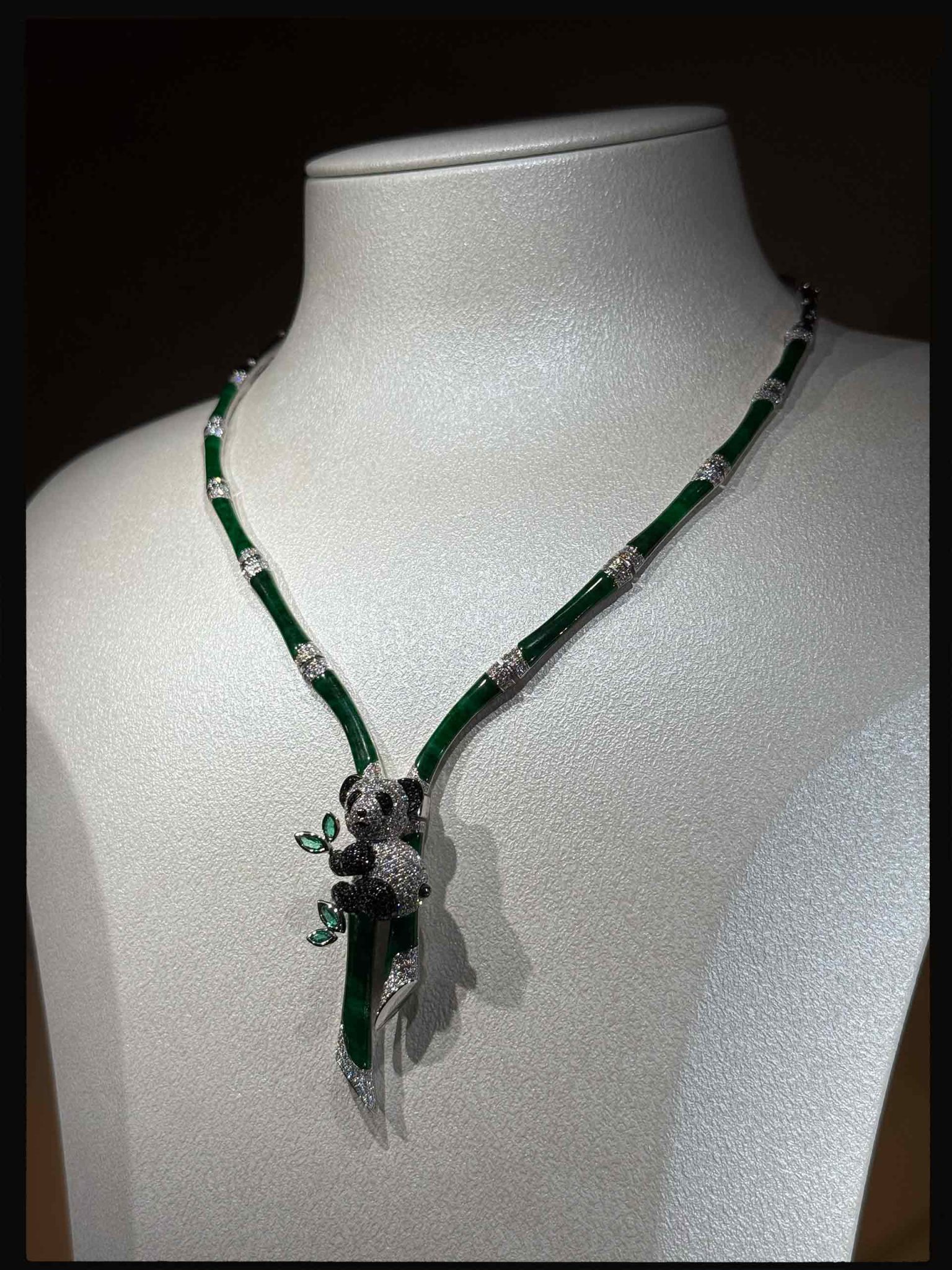 Otro ámbito estuvo dedicado a la colección Bamboo, un tributo a una de las veneradas plantas de los “Cuatro Caballeros” de la cultura china, símbolo de virtud y resistencia. Aquí, los metales preciosos se encontraron con formas poéticas, mientras las mariposas se posaban delicadamente en las juntas de bambú, y el juguetón panda Bo Bo, la querida mascota de Qeelin, trepaba y se aferraba a tallos esculturales de oro blanco y jadeíta, representados con una delicadeza impresionante.