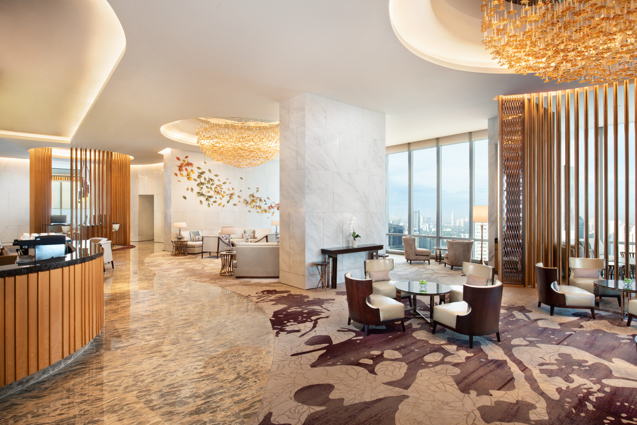 Salón de champán: Un espacio sofisticado para relajarse después de un largo día, con bebidas clásicas y vistas panorámicas del resplandeciente horizonte de Yakarta.
