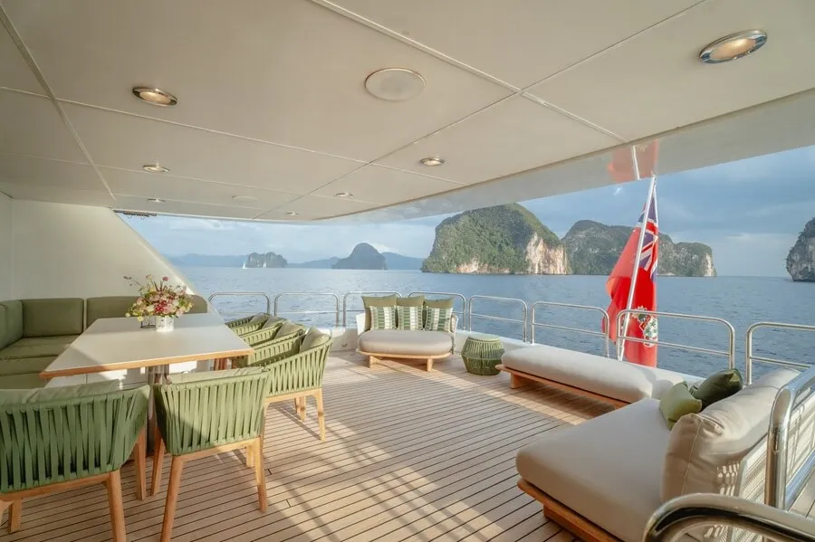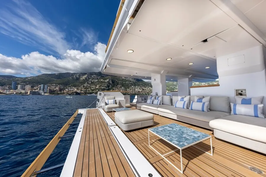 La cubierta principal de popa se convierte de mesas de café en comedor a la sombra, y en proa un puente portugués cuenta con tumbonas y un jacuzzi. La terraza ofrece cenas a la sombra, un bar, barbacoa y un espacio abierto en popa para un uso versátil.