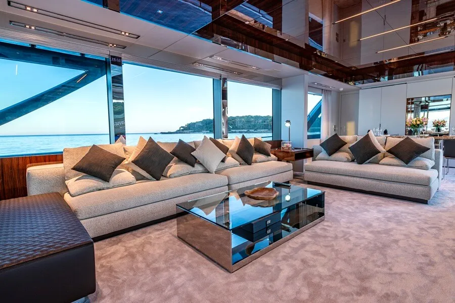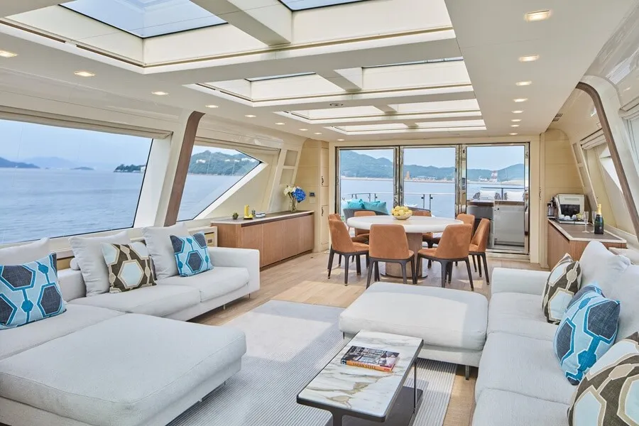 A proa, un salón de proa pasa de ser un lugar para tomar café por la mañana a un comedor completo, mientras que el bar interior y exterior de la cubierta de popa conecta el salón principal con el mar. Arriba, la terraza skylounge alberga una cocina completamente al aire libre con dos barbacoas, ideal para recibir invitados a bordo.