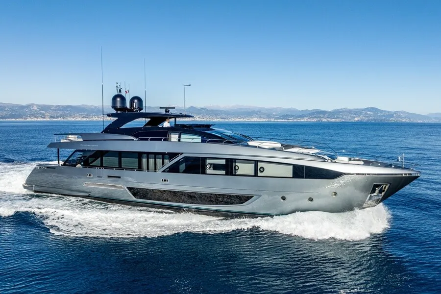 Su casco plateado está enmarcado por ventanas tintadas de oscuro que forman una cinta continua a lo largo de la cubierta principal, acentuada por detalles de acero inoxidable pulido. En el interior, las paredes de vidrio inundan el salón con luz, iluminando palisandro de alto brillo y cueros de color gris pálido, materiales perfeccionados en los íconos más pequeños de Riva.