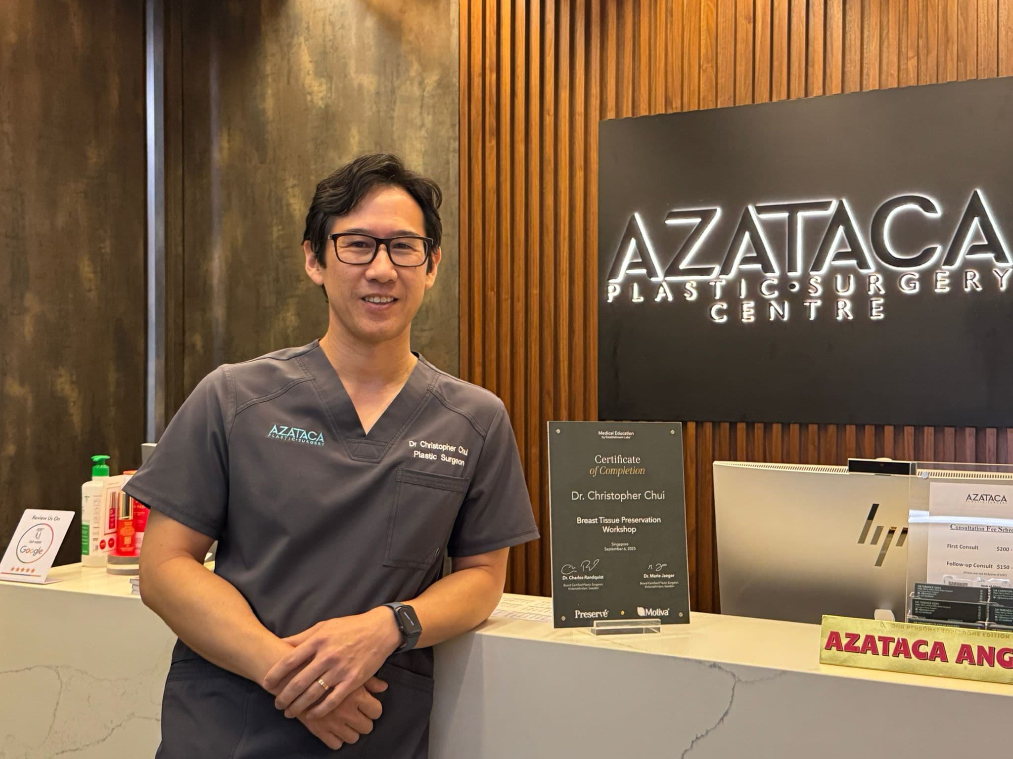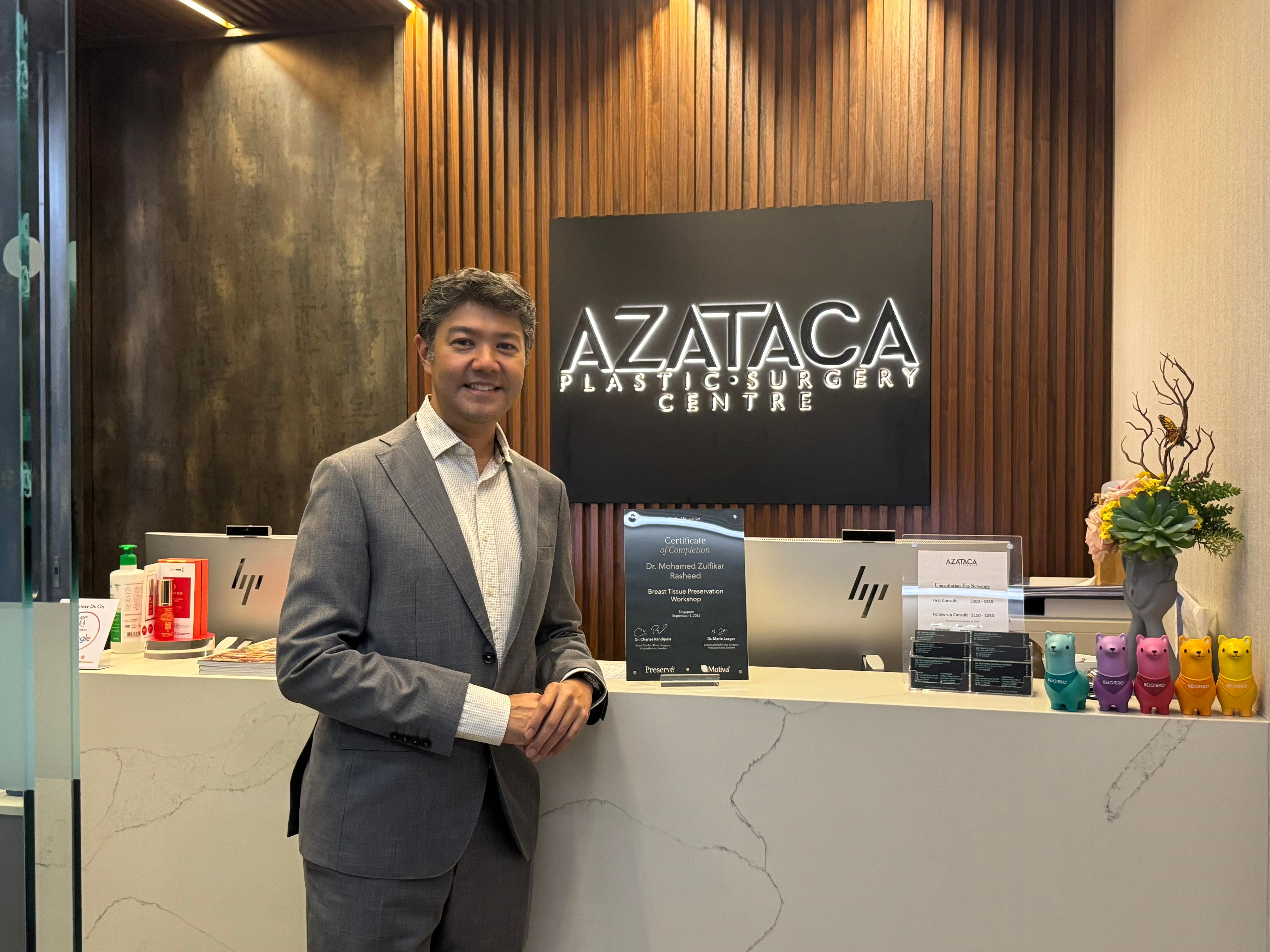 Entre los primeros en adoptarlo se encuentran tres cirujanos plásticos de Azataca con sede en Singapur. Los pacientes que acuden a AZATACA Plastic Surgery lo hacen por un espectro de necesidades que abarcan disciplinas tanto reconstructivas como estéticas, desde procedimientos médicamente necesarios hasta mejoras altamente individualizadas. En el centro de la práctica se encuentra un equipo de cirujanos plásticos acreditados por el Ministerio de Salud (MOH), cada uno de los cuales aporta una amplia experiencia en las principales instituciones médicas de Singapur. El Dr. Christopher Chui, el Dr. Mohamed Zulfikar Rasheed y el Dr. Terence Goh forman parte del primer grupo de médicos de Asia capacitados en el método Preservé. En conjunto, representan una experiencia combinada de más de dos décadas cada uno en cirugía plástica y reconstructiva, con un fuerte enfoque en procedimientos relacionados con los senos.