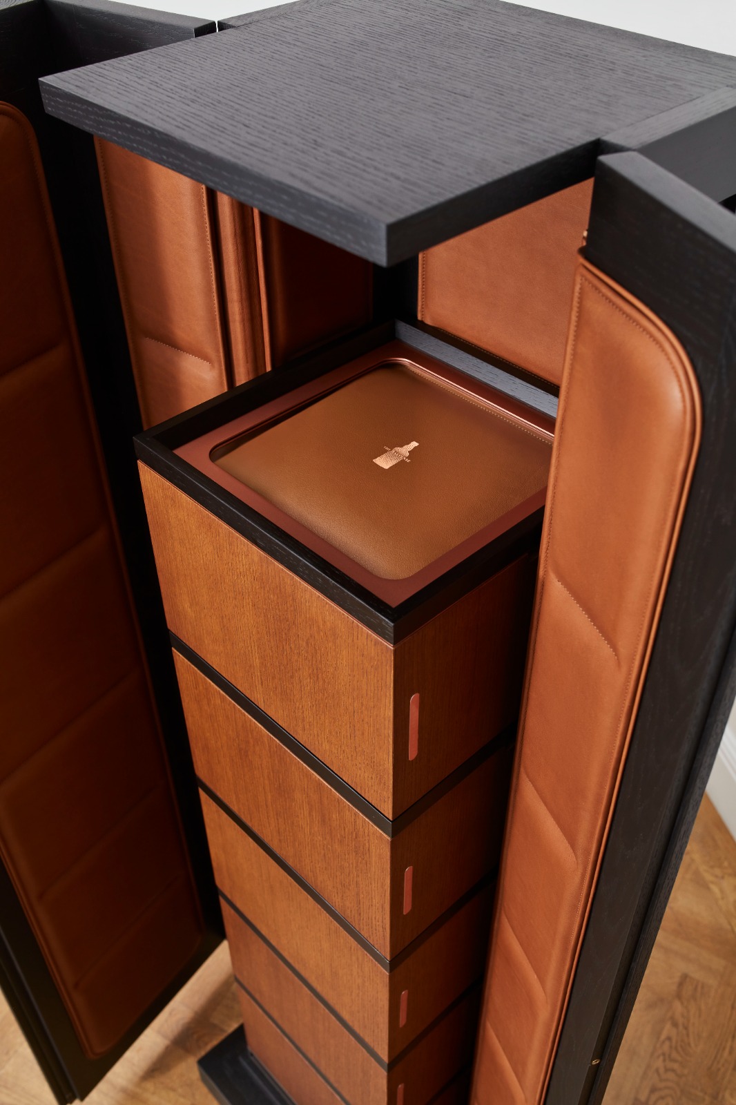 Inspirándose en la transformación alquímica dentro de los alambiques de cobre de The Balvenie, el elemento cobre ocupa un lugar destacado en cada detalle del diseño, desde las jarras y los ataúdes hasta el palanquín mismo. La técnica de “Alquimia del Cobre” de Amberg adorna el frente de cada cofre con una placa de cobre oxidada única, cuyos tonos cambiantes son un tributo a las reacciones naturales que ocurren en los alambiques.