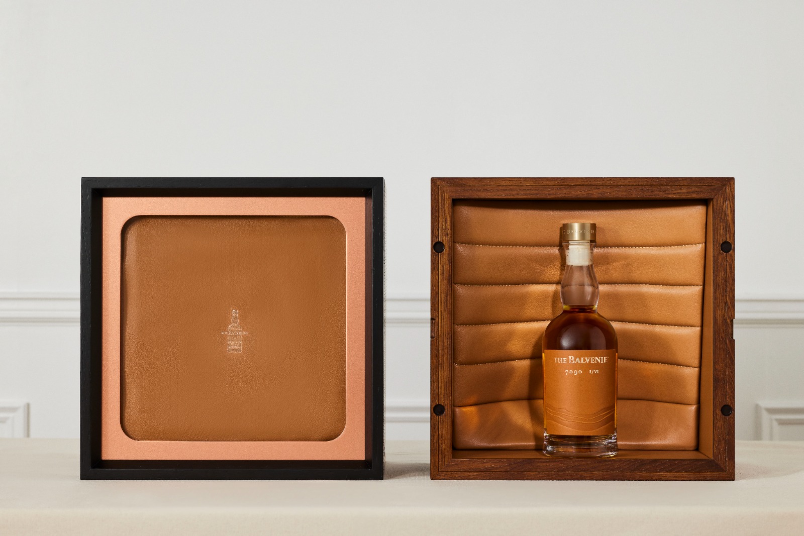 El Balvenie Cask 7090 Bill Amberg Palanquin Edition se erige como uno de los lanzamientos en barrica única más excepcionales de la destilería. Envejecido durante medio siglo en The Balvenie Distillery, Cask 7090 ha sido seleccionado personalmente por la maestra de malta Kelsey McKechnie como un reflejo perfecto del carácter perdurable de la casa. Para esta edición, The Balvenie se asoció con el célebre artesano británico del cuero Bill Amberg para crear un palanquín hecho a medida: un cofre portátil diseñado para albergar seis decantadores de cristal soplados a mano. La creación combina la elaboración tradicional de whisky escocés con el ingenio de diseño de Amberg, uniendo dos mundos de meticulosa artesanía.