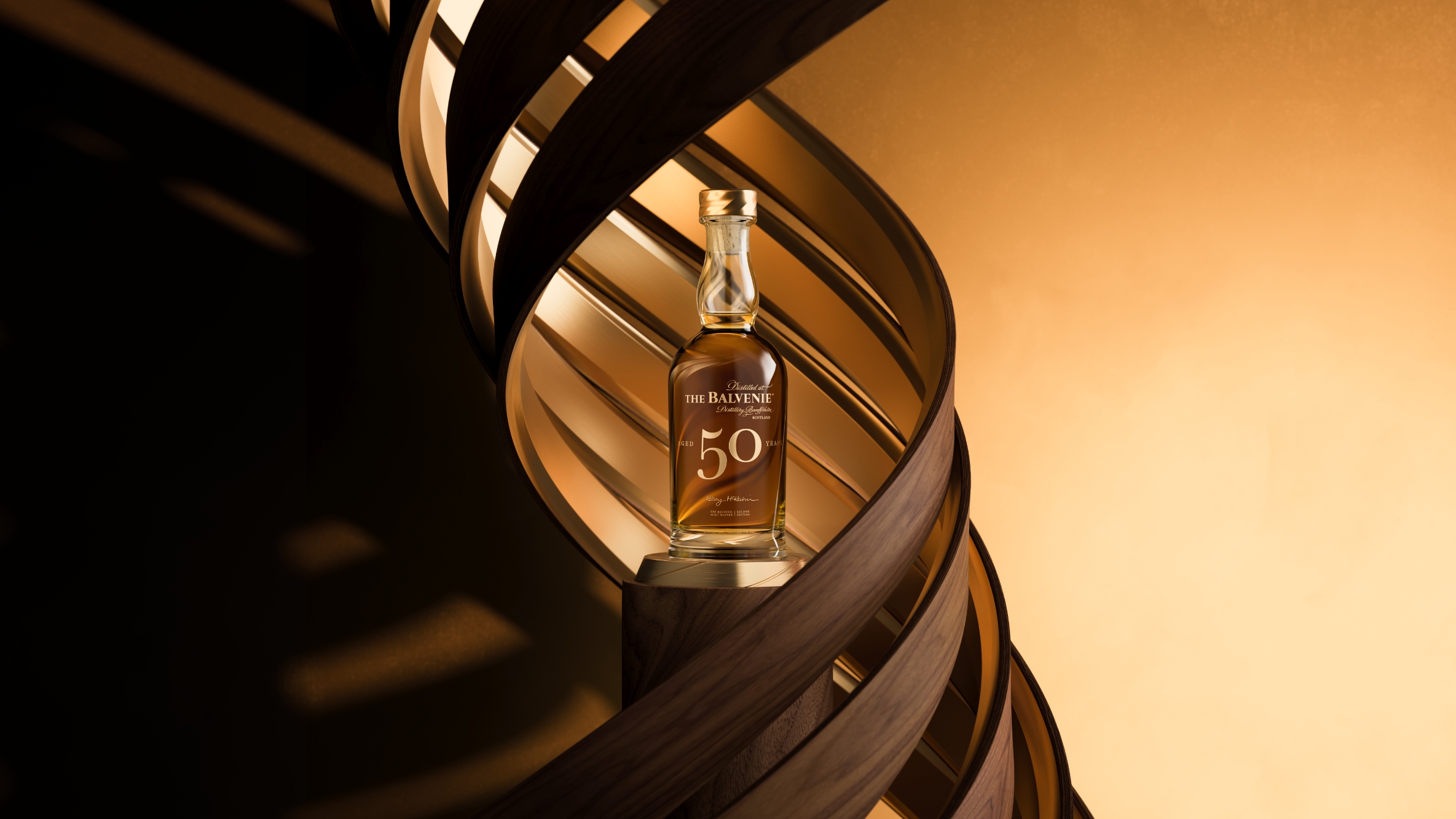 El Balvenie Fifty también viene en un empaque exquisito creado en colaboración con Croglin, un taller de artesanía personalizado en Cumbria. Cada vitrina incorpora más de 100 componentes elaborados individualmente para crear una estructura de hélice conceptual, compuesta de cuatro capas de madera con una tolerancia de precisión de menos de 1/10 de milímetro que encierra la botella. La exhibición bellamente elaborada, adornada con latón chapado en oro de 14 quilates, da como resultado una pieza de colección que encapsula el espíritu de The Balvenie, una donde cada detalle, desde el líquido que contiene hasta el recipiente que lo contiene, cuenta una historia de dedicación y artesanía duradera.