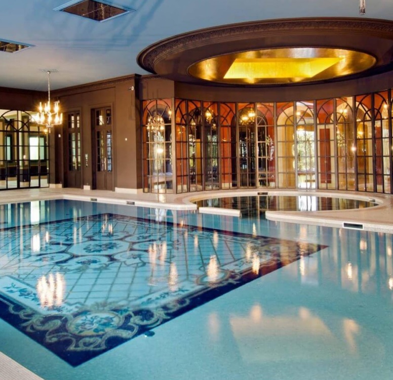 Izquierda: una piscina cubierta con temperatura controlada y un jacuzzi. Imagen: Topclosings.