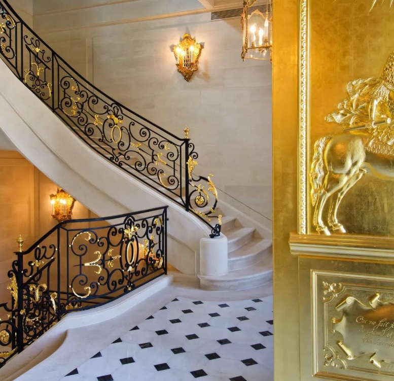 Derecha: Escalera y puertas adornadas con detalles dorados. Imagen: Topclosings.