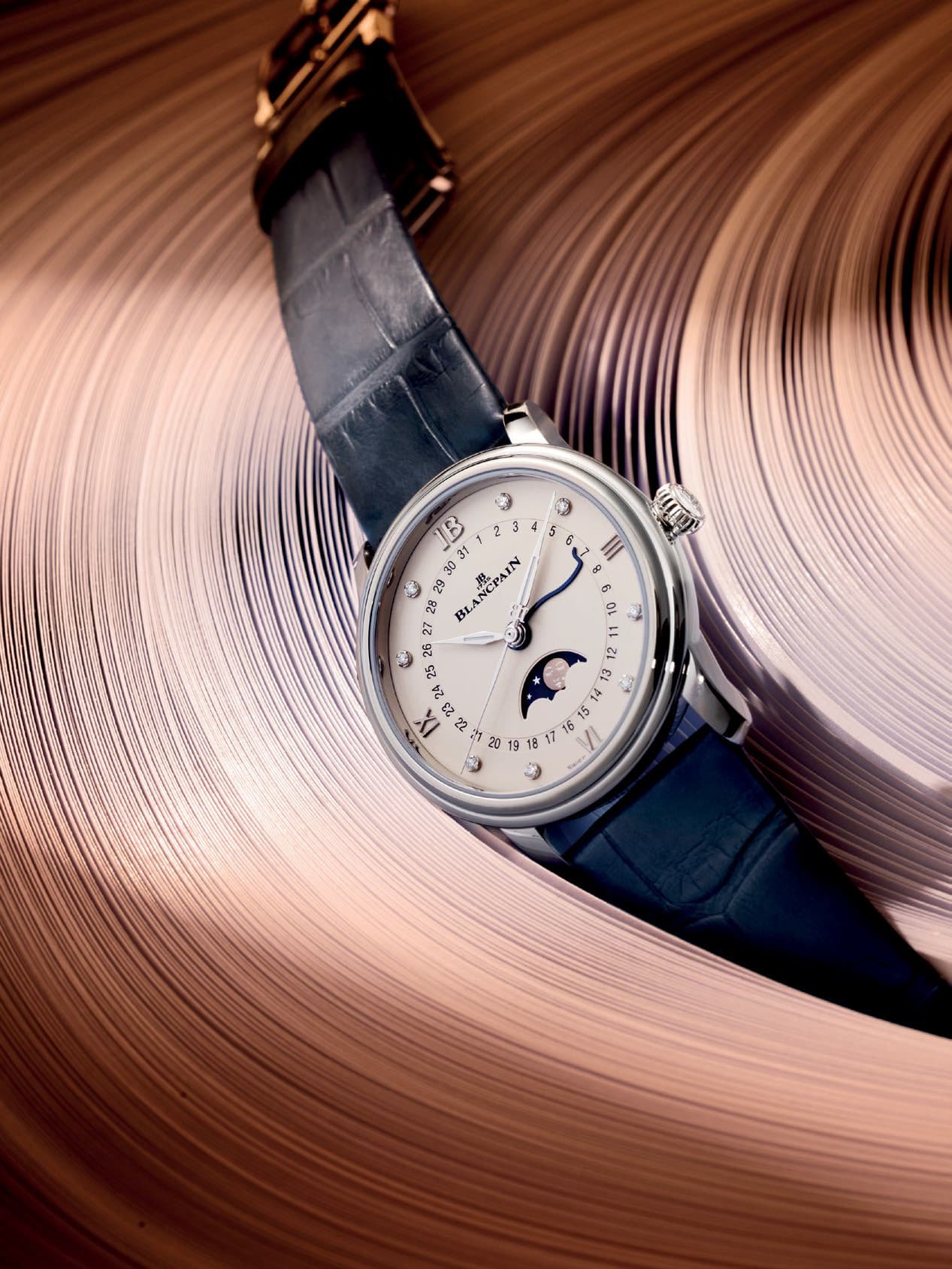 Blancpain introdujo el estilo Villeret en 1983 como parte de su (antigua) colección Classique, en forma de las referencias Complete Calendar Moonphase 6595 y 6395, que medían 34 mm y 26 mm respectivamente; este último incluso se ganó el título de calendario lunar con fases lunares completas más pequeño de su época. La fase lunar, concebida para seguir la evolución de un ciclo lunar con precisión y arte, se empleó aquí como una manifestación física diminuta pero significativa de la marca clavándose y colocando todos sus chips metafóricos en relojes mecánicos. Recordemos que la revolución/crisis del cuarzo había causado estragos en la industria relojera durante más de una década en ese momento, y continuaría durante algunos años más. «Nunca ha habido un Blancpain de cuarzo. Y nunca lo habrá», declaraban con orgullo los primeros anuncios de la campaña de marketing de Blancpain de esa época.