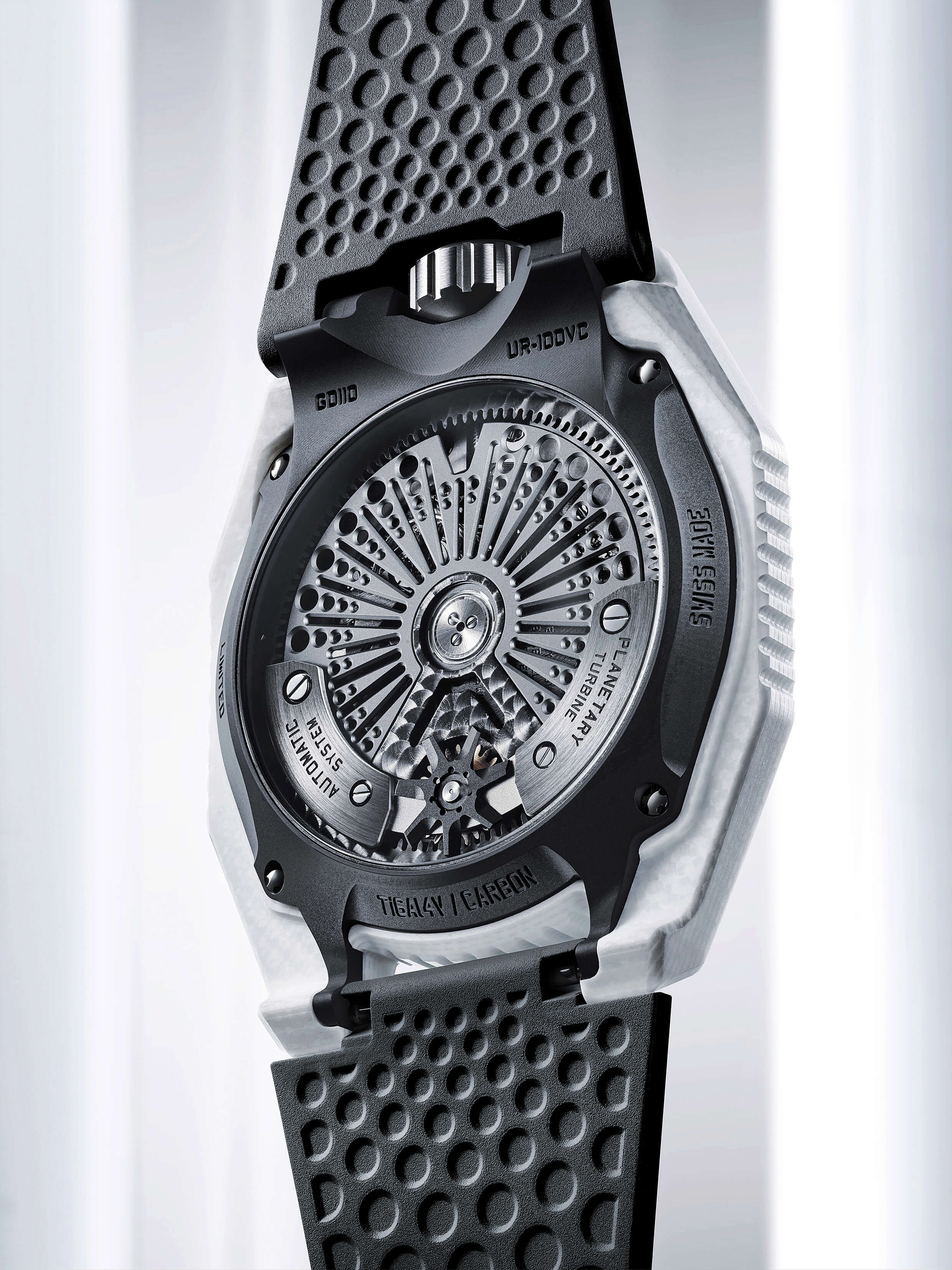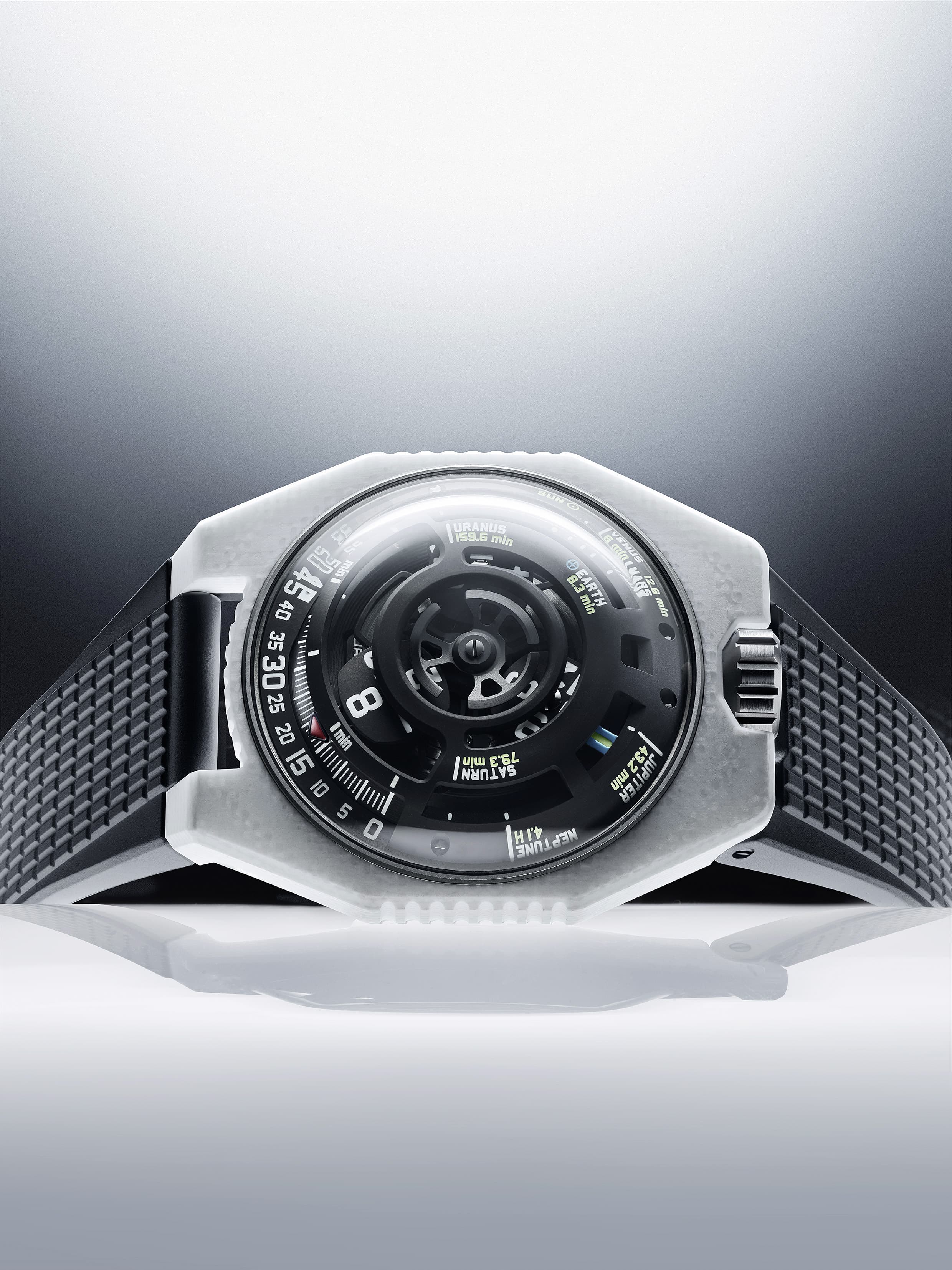 Debajo de la visualización planetaria tridimensional late el calibre automático UR 12.02. El movimiento presenta una estructura cinemática distribuida en tres placas de aleación ARCAP, elegidas por su estabilidad a largo plazo. La eficiencia del bobinado se rige por el sistema «Windfänger», una turbina resistente al aire que evita que el rotor se enrolle demasiado o experimente un desgaste excesivo durante el movimiento de alta actividad.