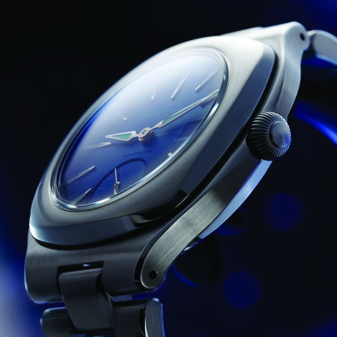 Una variedad de acabados que se encuentran en todo el reloj crea una sensación palpable de dinamismo y contraste, y fortalece la conexión con la belleza mecánica del diseño y la construcción del automóvil: un bisel circular satinado, flancos pulidos a espejo, una caja vertical satinada y un brazalete, hasta los lados pulidos inclinados de los eslabones centrales, que en conjunto crean una impresionante interacción de luces y tonos. La corona en forma de bola característica de Laurent Ferrier, integrada en la carrura, no sólo aumenta la complejidad de la estética del Sport Auto, sino que sus generosas proporciones mejoran la facilidad de cuerda.