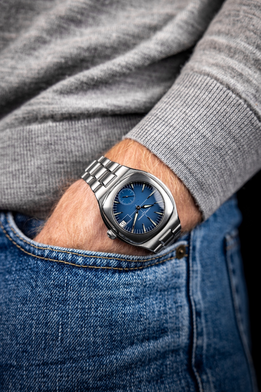 Un sutil azul degradado con un acabado opalino domina la esfera, contrastada con una escala de minutos gris y una cruz central, así como una esfera con segundero pequeño a las 6 en punto con marcadores en forma de caracol en color gris polvo. Índices y agujas en forma de punta de lanza “Assegai” de oro blanco y rellenas de Super-LumiNova verde, y una ventanilla de fecha biselada a las 3 completan el resto de elementos concebidos para ofrecer la máxima legibilidad y contraste.