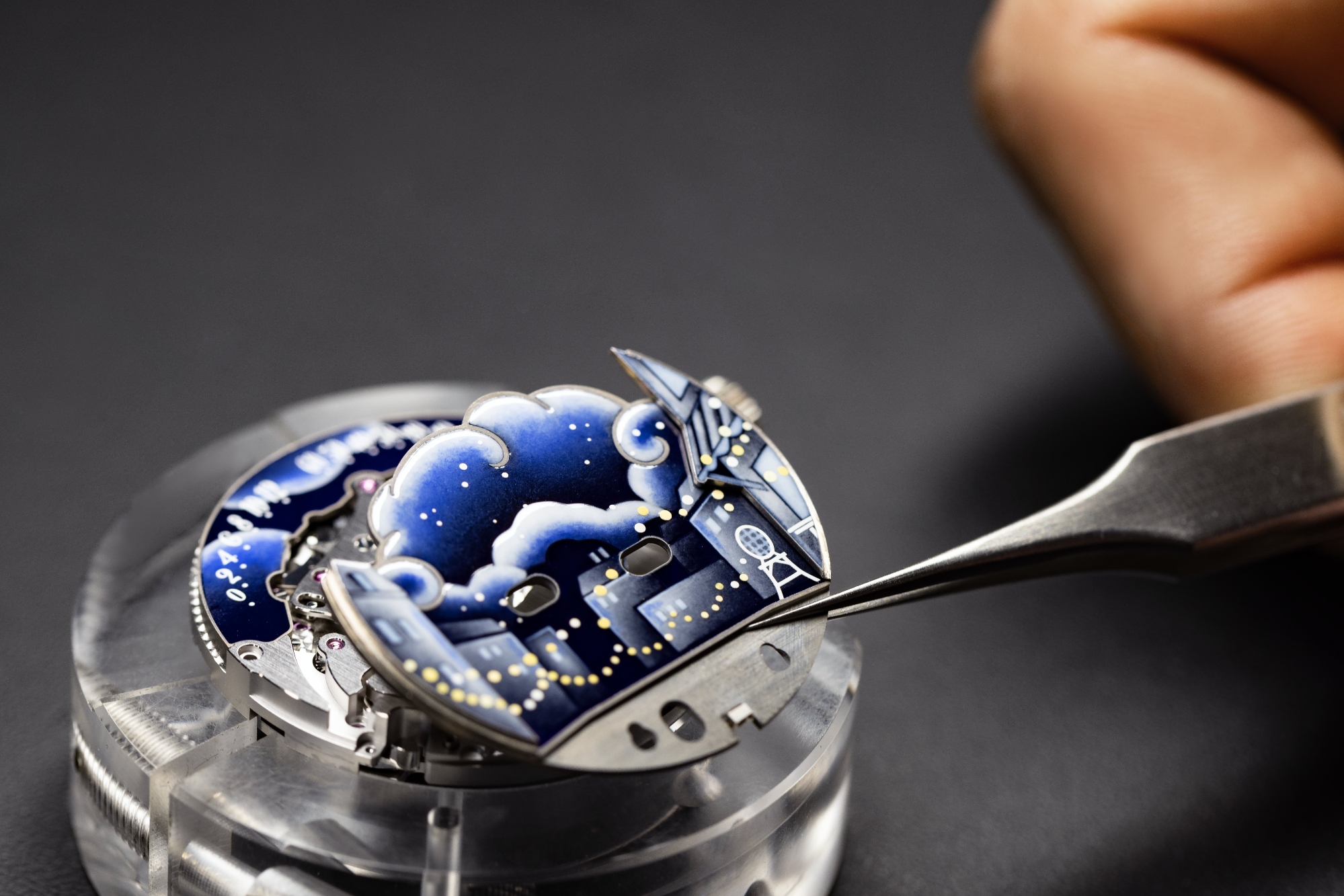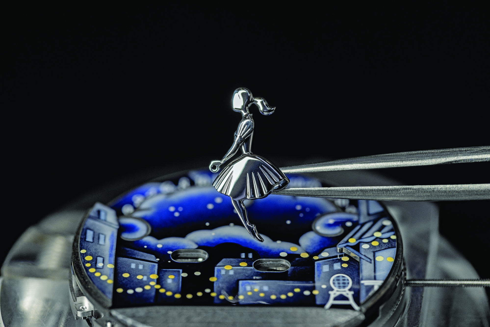Para resaltar la dramática dimensión de la escena, la casa recurrió a sus maestros esmaltadores y pintores de miniaturas que hicieron un uso extraordinario de la técnica del esmalte grisalla, desarrollada en la Francia del siglo XVI. El uso de esmalte grisalla tradicional (aplicando polvo de esmalte blanco) sobre el fondo azul oscuro, así como esmalte grisalla de color (aplicando diferentes tonos de azul y amarillo) mejora la percepción de profundidad en la esfera, al evocar el claroscuro (en italiano, «claro-oscuro», que describe una técnica de uso de tonos claros y oscuros para transmitir una sensación de volumen, y fue ampliamente utilizado por pintores desde el Renacimiento hasta el siglo XIX, dando a la esfera una sensación de profundidad tridimensional que refleja el drama y el romance del propio París.