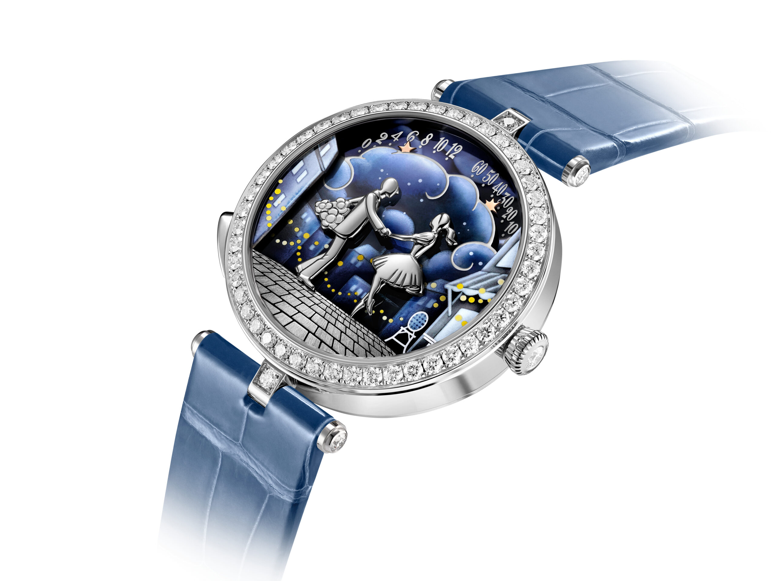 El delicado detalle, donde los brazos articulados de las figuras se entrelazan y bajan exactamente cuando ambos personajes se inclinan el uno hacia el otro, es engañosamente simple: crear esta secuencia fluida de movimientos que son diminutos pero extremadamente realistas y de aspecto natural pero que no afectan la precisión del mecanismo, requirió un movimiento novedoso, cuya creación requirió cuatro años de investigación y desarrollo. El resultado es un movimiento automático con 36 horas de reserva de marcha y una capa adicional de complejidad sobre la ya fascinante serie Pont des Amoureux. Otra actualización del Pont des Amoureux: en lugar de que la propia pareja indique la hora y los minutos, en el reloj Bal des Amoureux Automate, esa tarea recae en dos estrellas que se deslizan por la cima de las nubes.